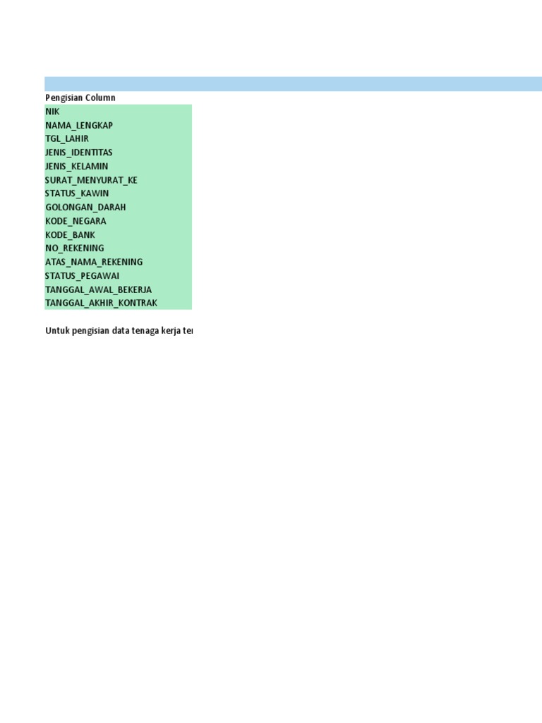 Berisi Status Pegawai dari tenaga kerja, diisi dengan kode status pegawai contoh : Y , keterangan : Jika Y adalah PKWT sedangk