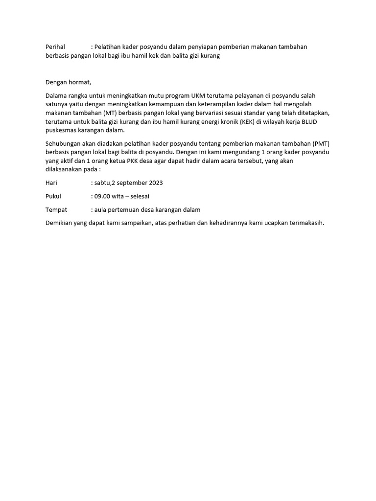 Sehubungan akan diadakan pelatihan kader posyandu tentang pemberian makanan tambahan (PMT)