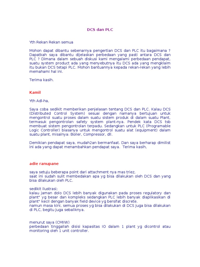 itu bagaimana ? Dapatkah saya dibantu dijelaskan perbedaan yang pasti antara DCS dan PLC ? Dimana dalam sebuah diskusi kami mengalami perbedaan pendapat, suatu system product ada yang menyebutnya itu DCS ada yang mengklaim itu bukan DCS tetapi PLC. Mohon bantuannya kepada rekan-rekan yang lebih memahami hal ini. Terima kasih. Kamil Yth Adl-ha, Saya coba sedikit memberikan penjelasan tentang DCS dan PLC. Kalau DCS (Distributed Control System) sesuai dengan namanya bertujuan untuk mengontrol suatu proses dalam suatu sistem produk di dalam suatu Plant, termasuk pengontrolan safety system plant-nya. Pendek kata DCS tsb membuat sistem pengontrolan terpadu. Sedangkan untuk PLC (Programable Logic Controller) biasanya untuk mengontrol suatu alat (equipment) dalam suatu plant, misalnya: Boiler, Compressor, dll. Demikian pendapat saya, mudah2an bermanfaat. Dan saya berharap dimilist ini ada yang dapat menambahkan pendapat saya. Terima kasih,