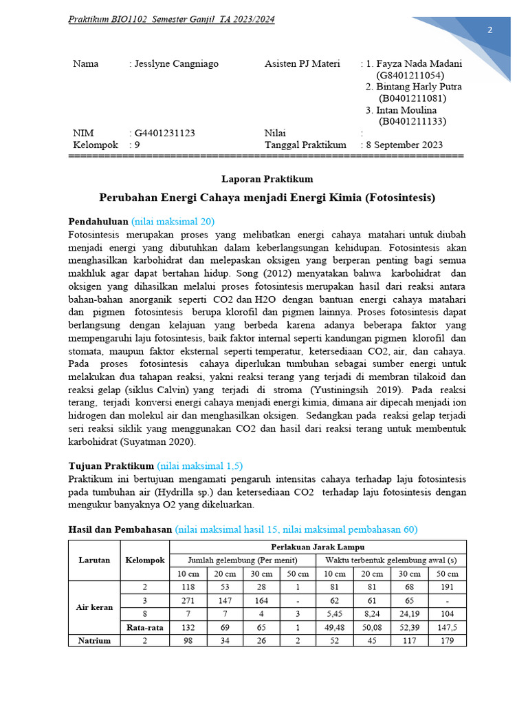 Praktikum ini bertujuan mengamati pengaruh intensitas cahaya terhadap laju fotosintesis