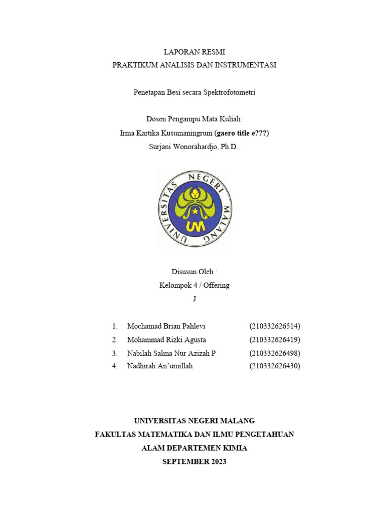 A. JUDUL PERCOBAAN : Penetapan Besi secara Spektrofotometri