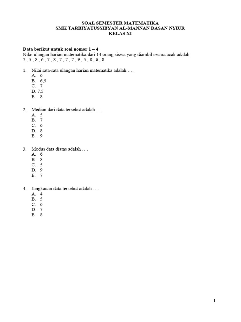1. Nilai rata-rata ulangan harian matematika adalah ….