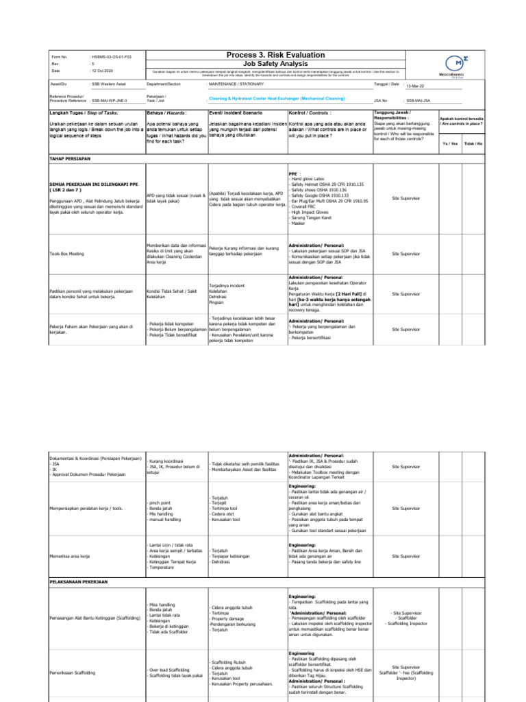 Date : 12 Oct 2020 Gunakan bagian ini untuk merinci pekerjaan menjadi langkah-langkah, mengidentifikasi bahaya dan kontrol serta menetapkan tanggung jawab untuk kontrol / Use this section to