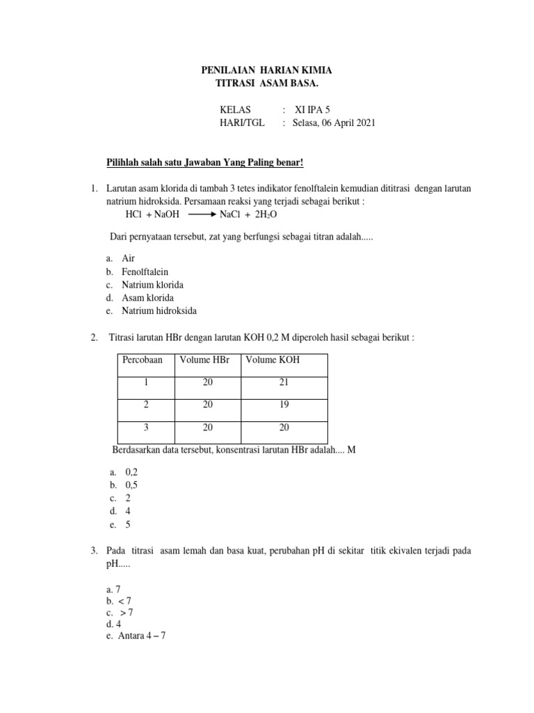 2. Titrasi larutan HBr dengan larutan KOH 0,2 M diperoleh hasil sebagai berikut :