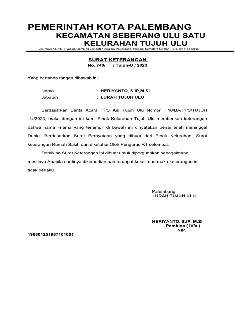 –U/2023, maka dengan ini kami Pihak Kelurahan Tujuh Ulu memberikan keterangan