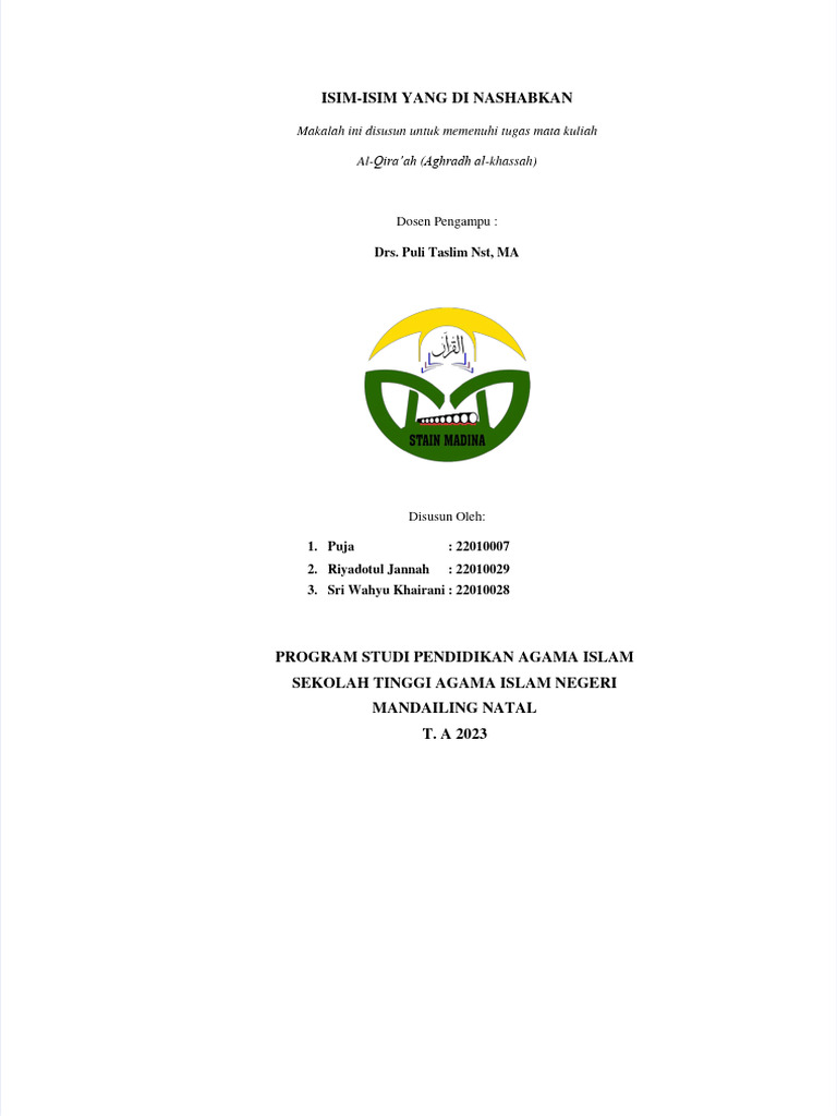 Makalah ini dibuat untuk memenuhi tugas mata kuliah “Al-Qira’ah (Aghradh al-Khassah)”.