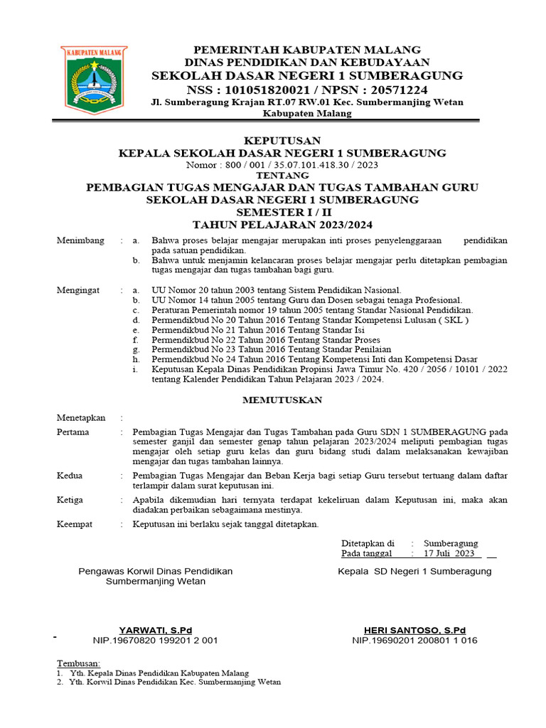 Lampiran I : Keputusan Kepala SDN 1 Sumberagung