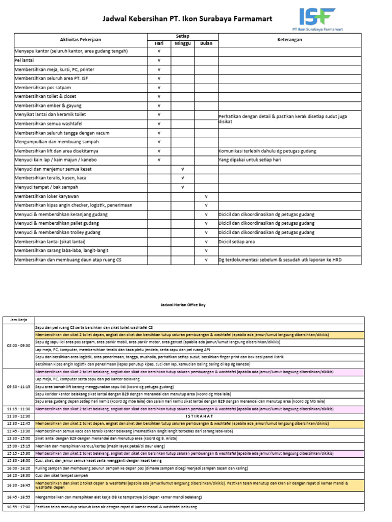 Sapu area gudang depan setiap hari kamis (koord dg mba laila) dan selain hari kamis sikat lantai dengan B29 dengan menandai dan menutup area (koord dg Mb laila)