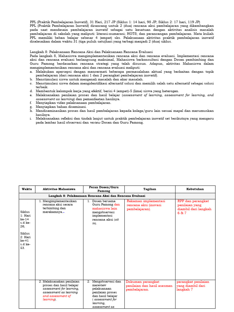 PPL (Praktik Pembelajaran Inovatif), 31 Hari, 217 JP (Siklus 1: 14 hari, 98 JP; Siklus 2: 17 hari, 119 JP)