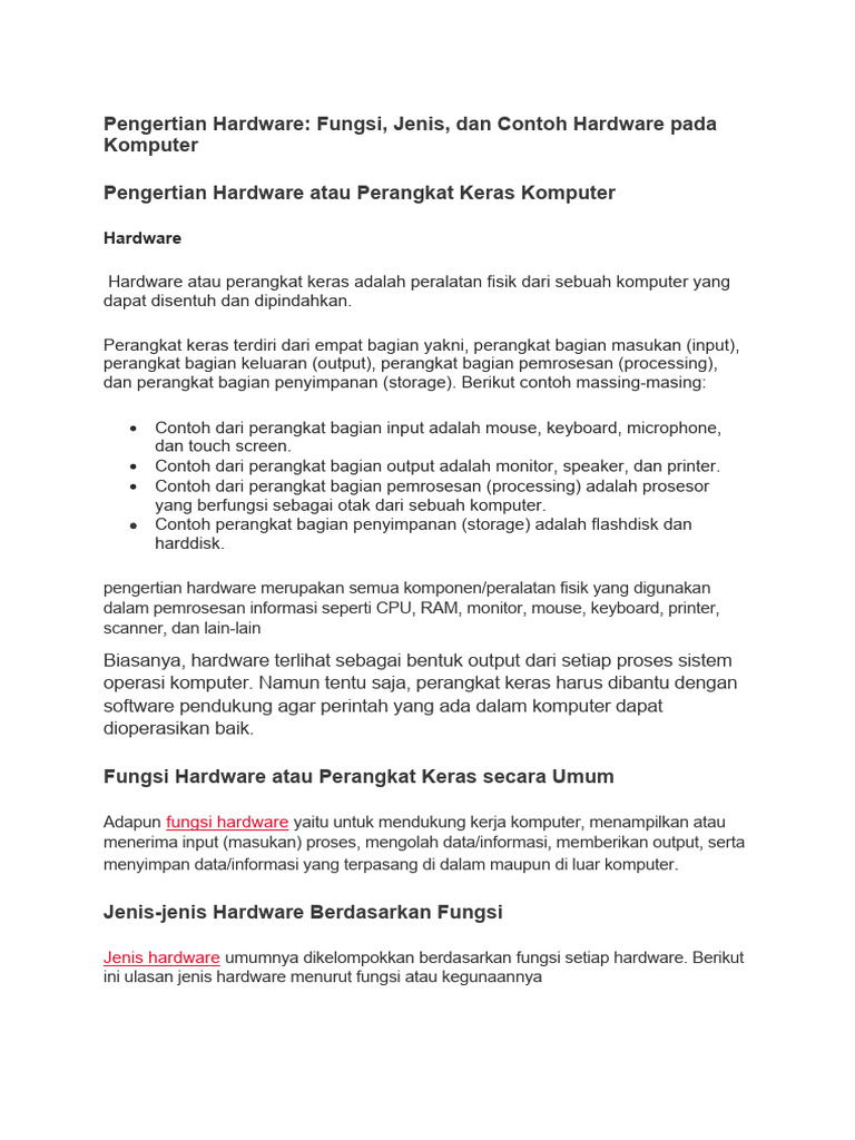 Jenis hardware umumnya dikelompokkan berdasarkan fungsi setiap hardware. Berikut