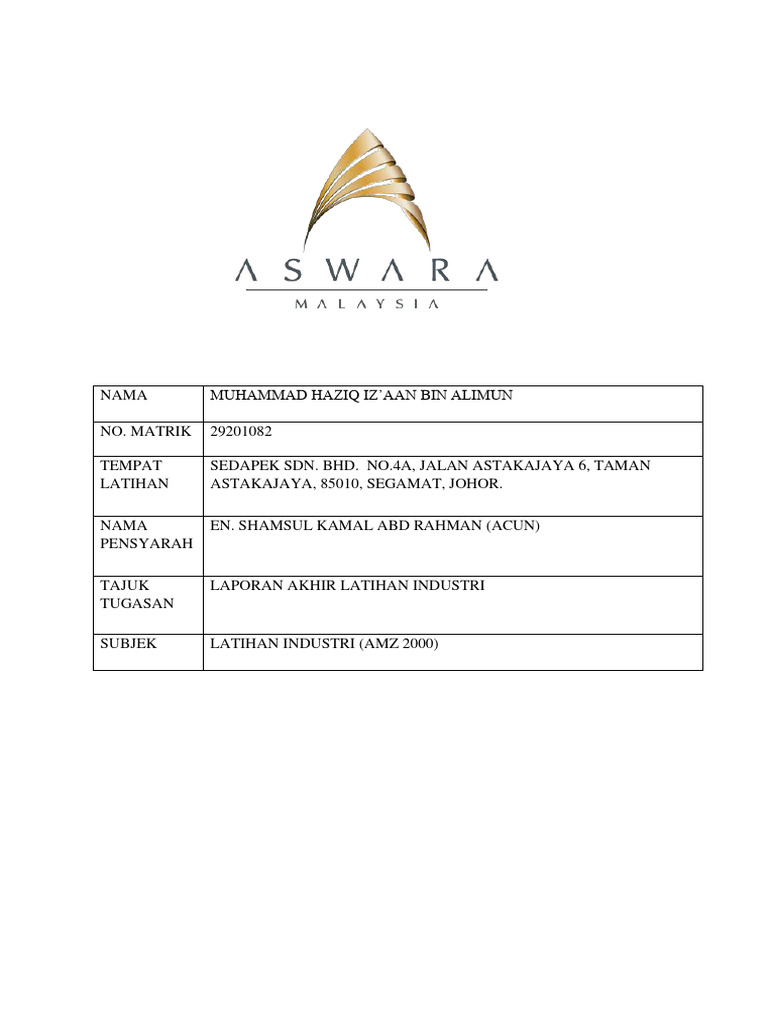 menjalani sesi diploma dan latihan industri ini. Akhir sekali, saya ingin meminta maaf jika ada