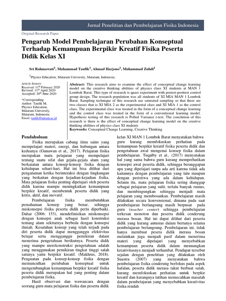 kreatif. Pembelajaran perubahan konseptual pembahasan, dapat disimpulkan bahwa terdapat