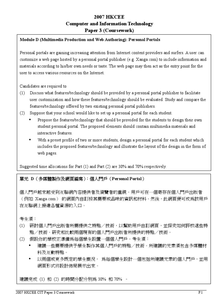 單元 D(多媒體製作及網頁編寫):個人門戶(Personal Portal)