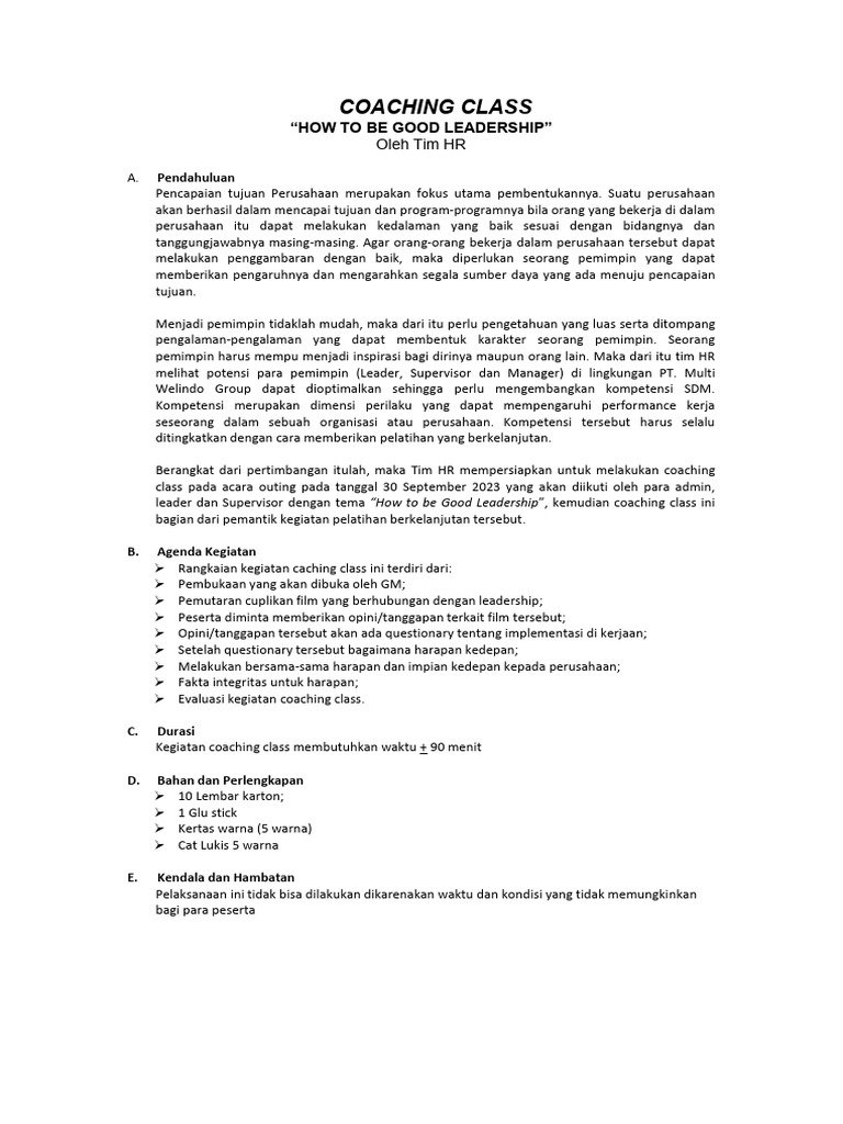leader dan Supervisor dengan tema “How to be Good Leadership”, kemudian coaching class ini