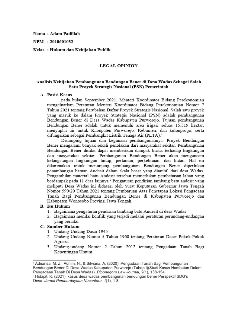 Analisis Kebijakan Pembangunan Bendungan Bener di Desa Wadas Sebagai Salah
