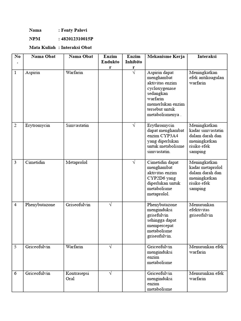 No Nama Obat Nama Obat Enzim Enzim Mekanisme Kerja Interaksi