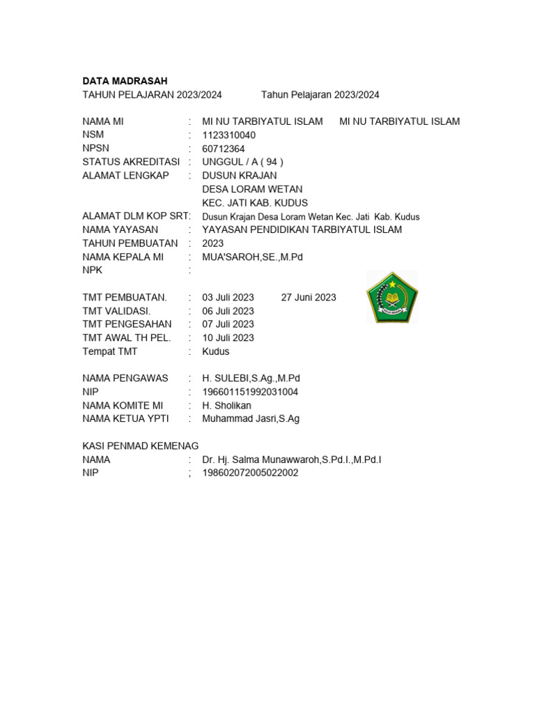 KURIKULUM OPRASIONAL MADRASAH TAHUN PELAJARAN 2023/2024.
