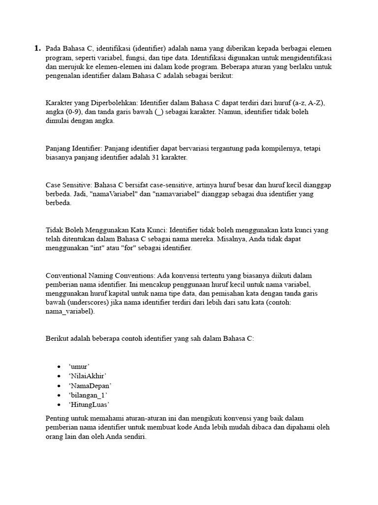 Karakter yang Diperbolehkan: Identifier dalam Bahasa C dapat terdiri dari huruf (a-z, A-Z),