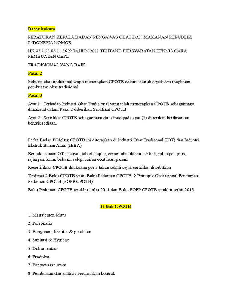 Perka Badan POM ttg CPOTB ini diterapkan di Industri Obat Tradisonal (IOT) dan Industri