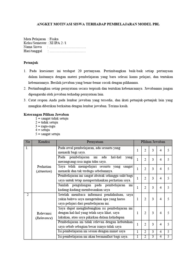 ANGKET MOTIVASI SISWA TERHADAP PEMBELAJARAN MODEL PBL