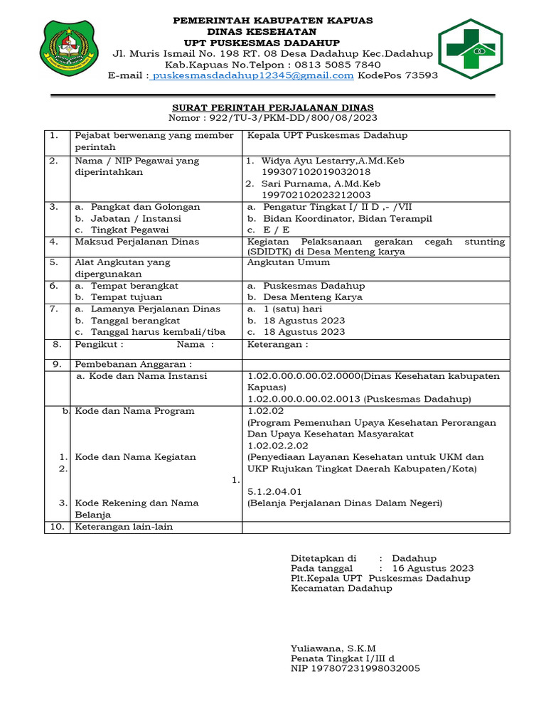 1. Pejabat berwenang yang member Kepala UPT Puskesmas Dadahup