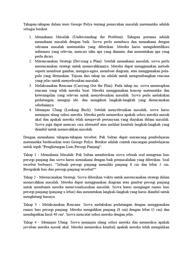 b. Berikut adalah rancangan pembelajaran matematika berdasarkan teori George Polya untuk materi