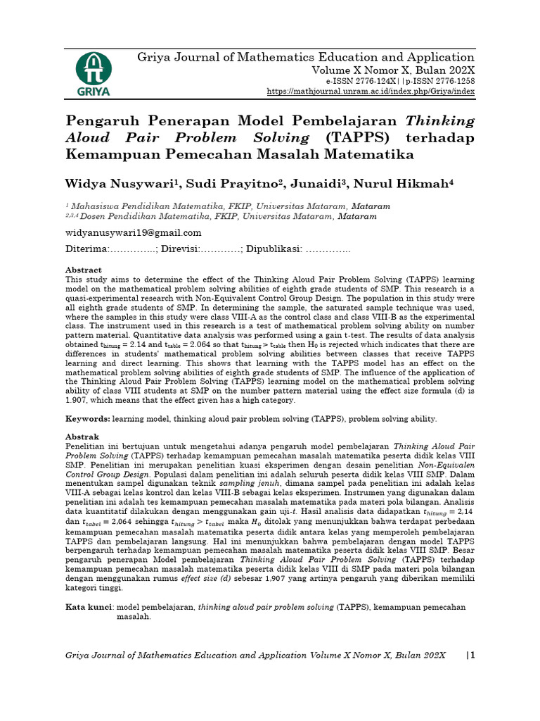 Kata kunci: model pembelajaran, thinking aloud pair problem solving (TAPPS), kemampuan pemecahan