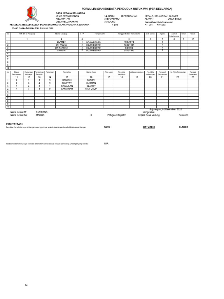 FORMULIR ISIAN BIODATA PENDUDUK UNTUK WNI (PER KELUARGA)