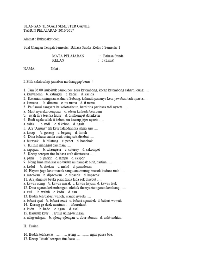 Soal Ulangan Tengah Semester Bahasa Sunda Kelas 5 Semester 1