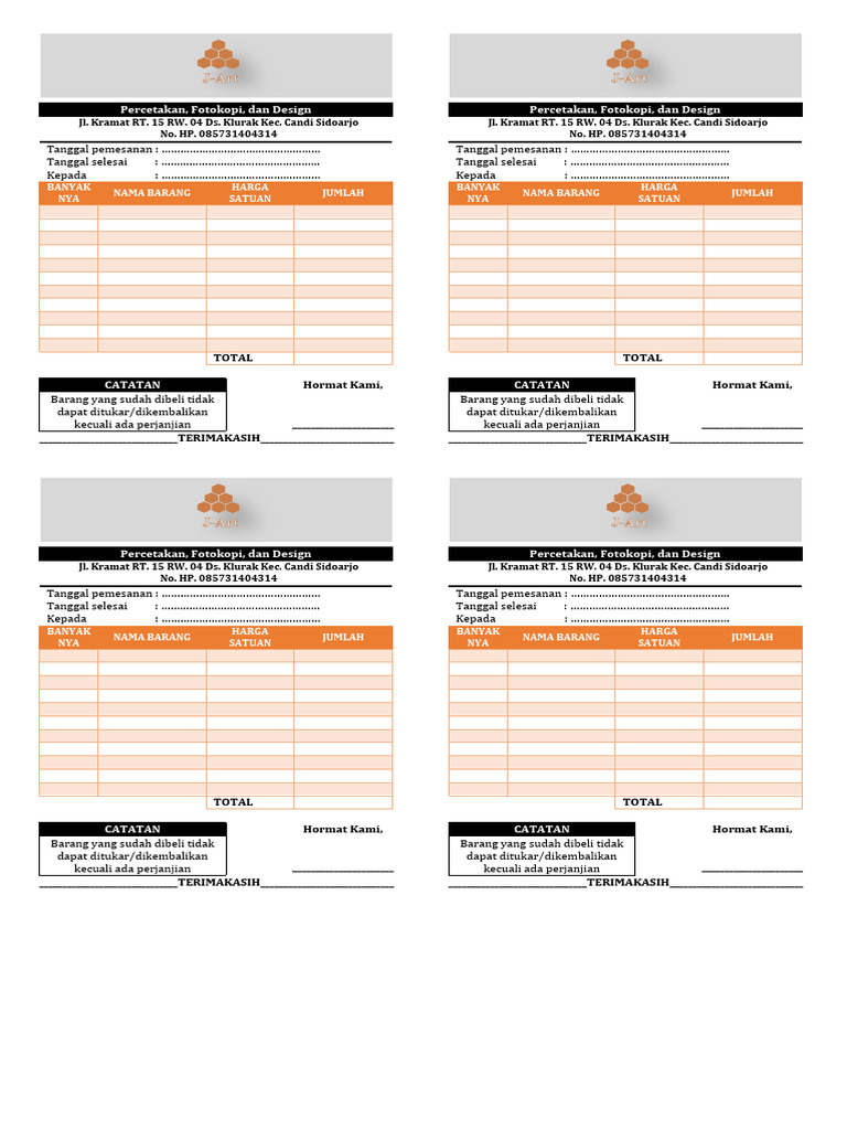 Tanggal pemesanan : …………………………………………… Tanggal pemesanan : ……………………………………………