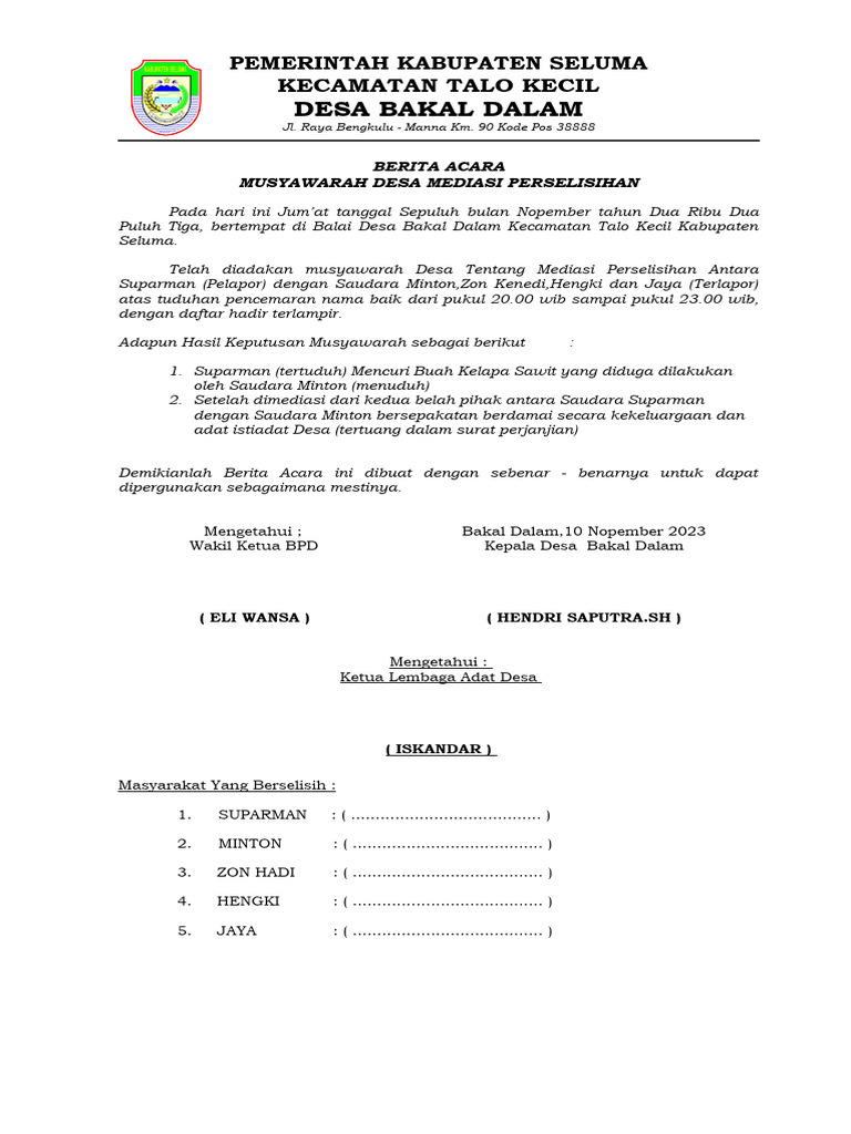 Telah diadakan musyawarah Desa Tentang Mediasi Perselisihan Antara