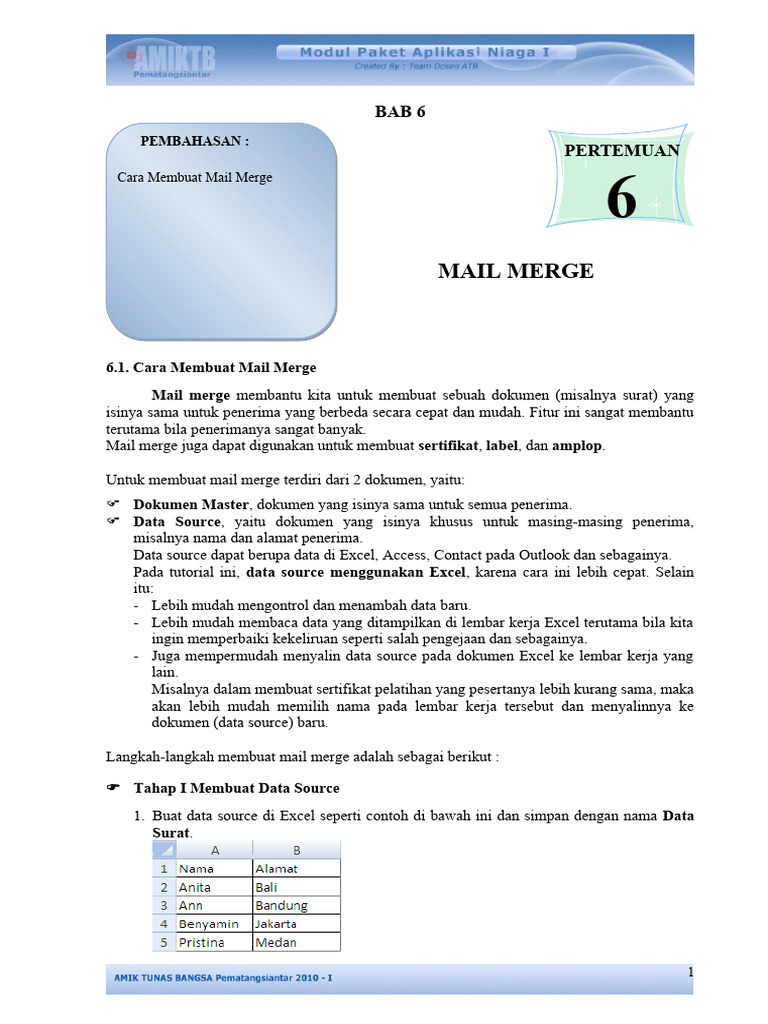 Untuk membuat mail merge terdiri dari 2 dokumen, yaitu:
