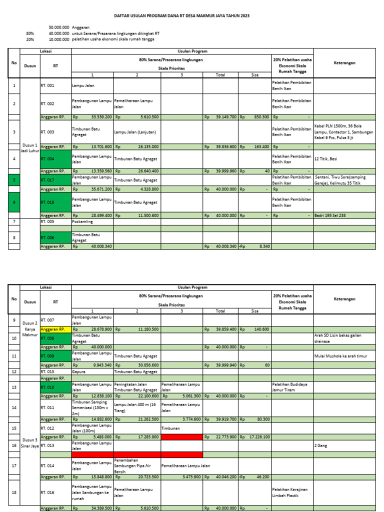 DAFTAR USULAN PROGRAM DANA RT DESA MAKMUR JAYA TAHUN 2023