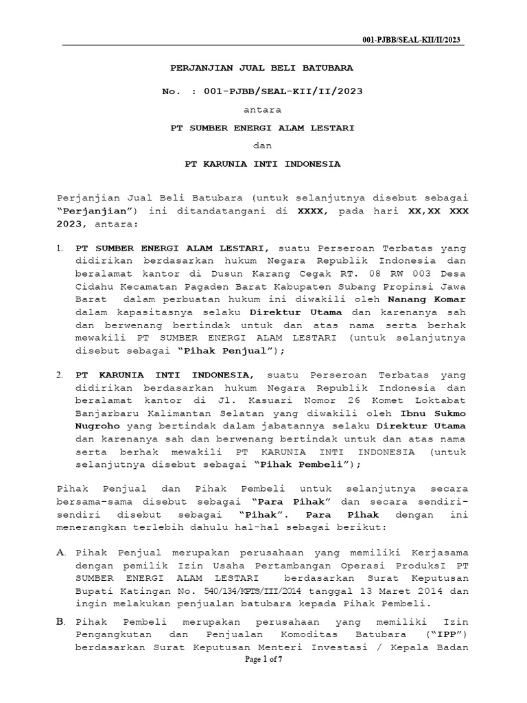Perjanjian Jual Beli Batubara (untuk selanjutnya disebut sebagai