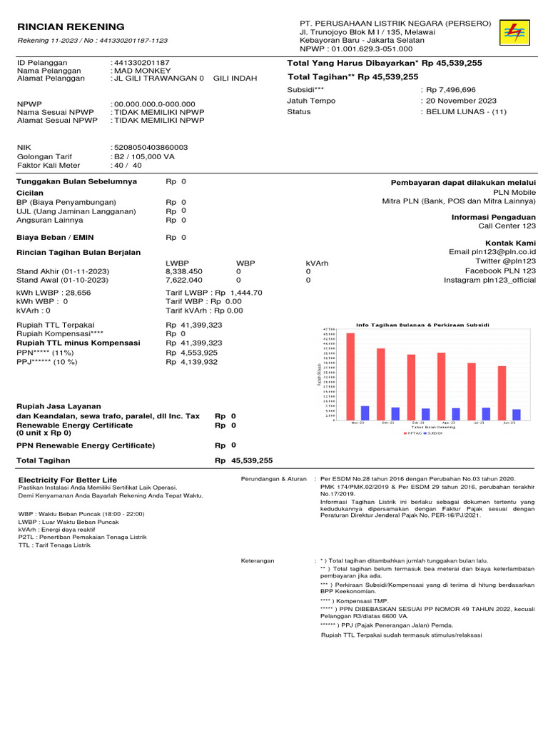 Alamat Pelanggan : JL GILI TRAWANGAN 0 GILI INDAH Total Tagihan** Rp 45,539,255