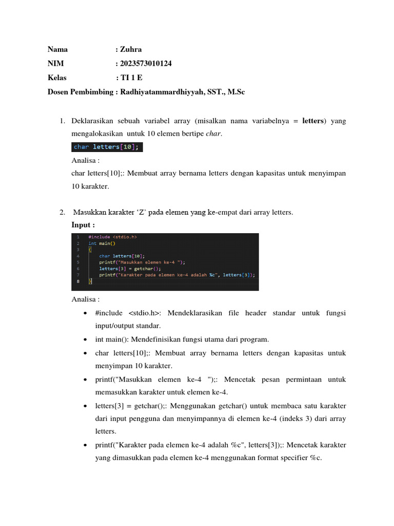 • printf("Karakter pada elemen ke-4 adalah %c", letters[3]);: Mencetak karakter