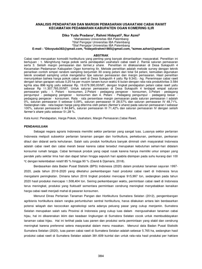 Kata kunci: Pendapatan, Harga Pokok, Usahatani, Margin Pemasaran,Cabai Rawit.