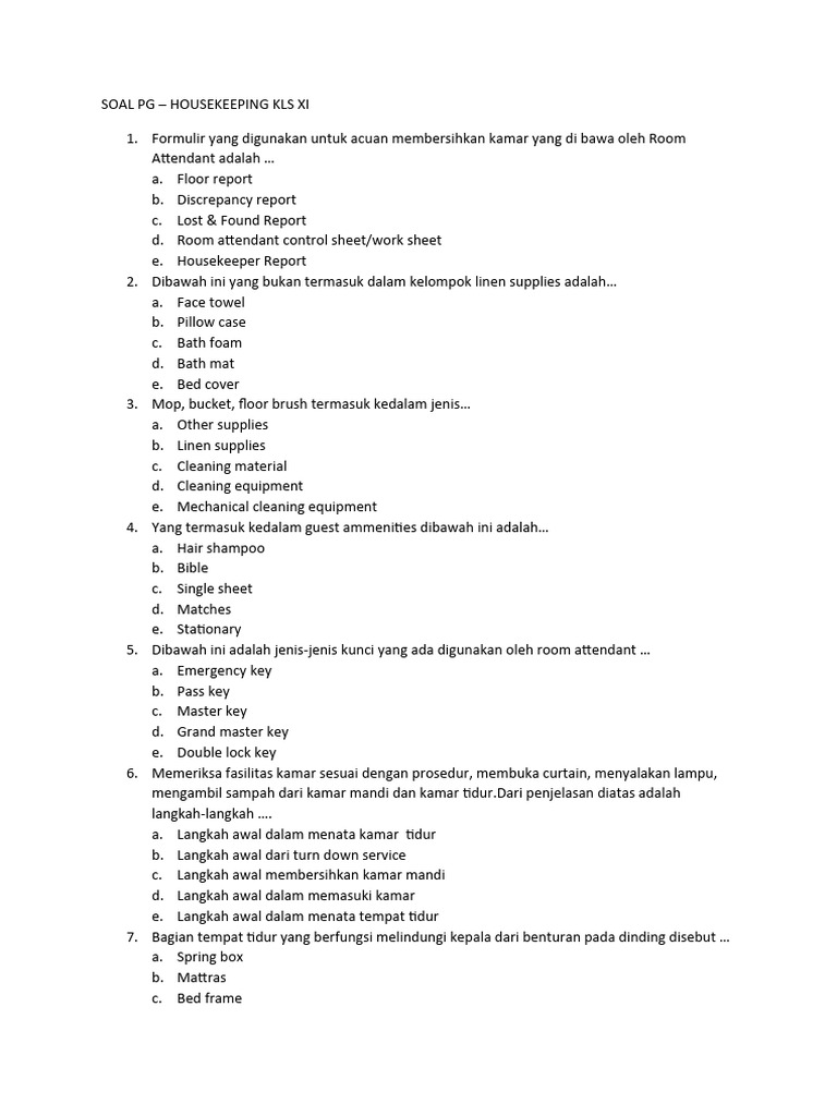 SOAL PG – HOUSEKEEPING KLS XI