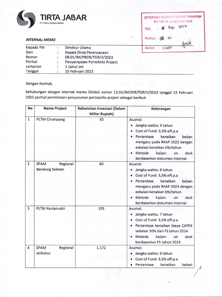 sehubungan denBan internal memo Direksi nomor 13.01/tM/D!R/TG R/ /2023 tanggal 13 Februari