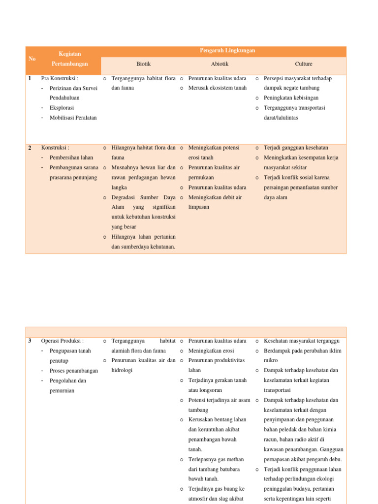 3 Operasi Produksi : o Terganggunya habitat o Penurunan kualitas udara o Kesehatan masyarakat terganggu