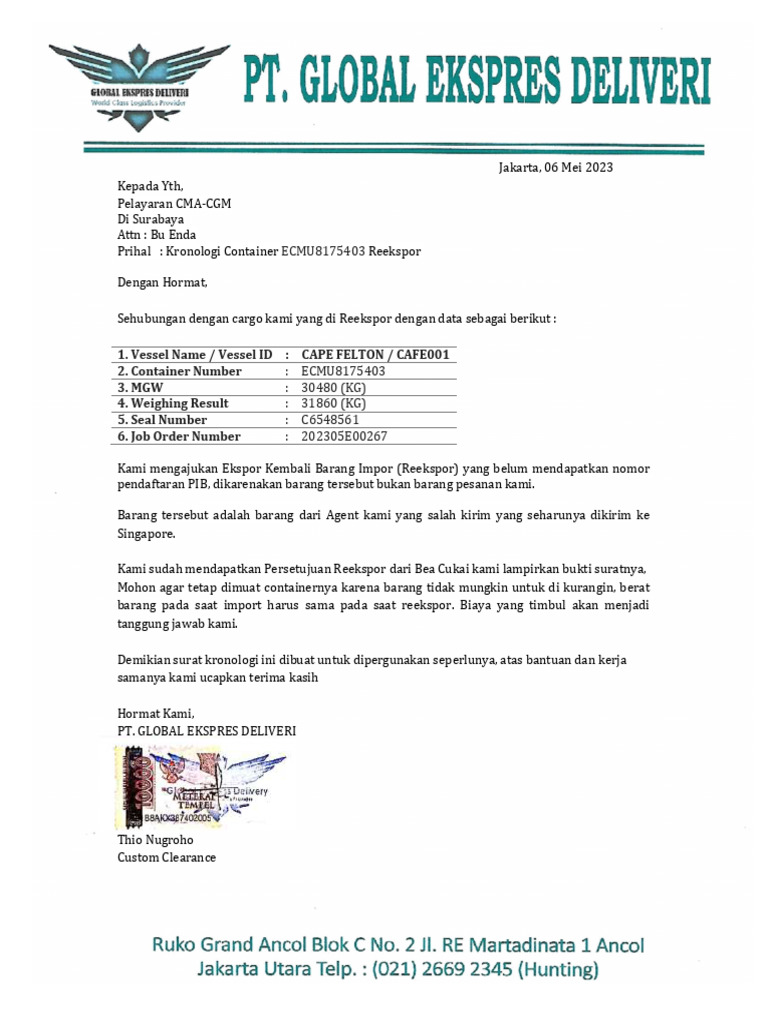 Sehubungan dengan cargo kami yang di Reekspor dengan data sebagai berikut :