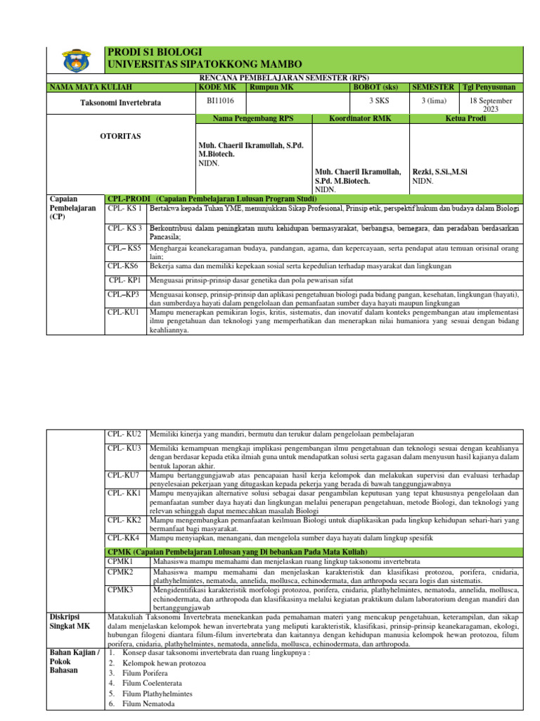 Diskripsi Matakuliah Taksonomi Invertebrata menekankan pada pemahaman materi yang mencakup pengetahuan, keterampilan, dan sikap
