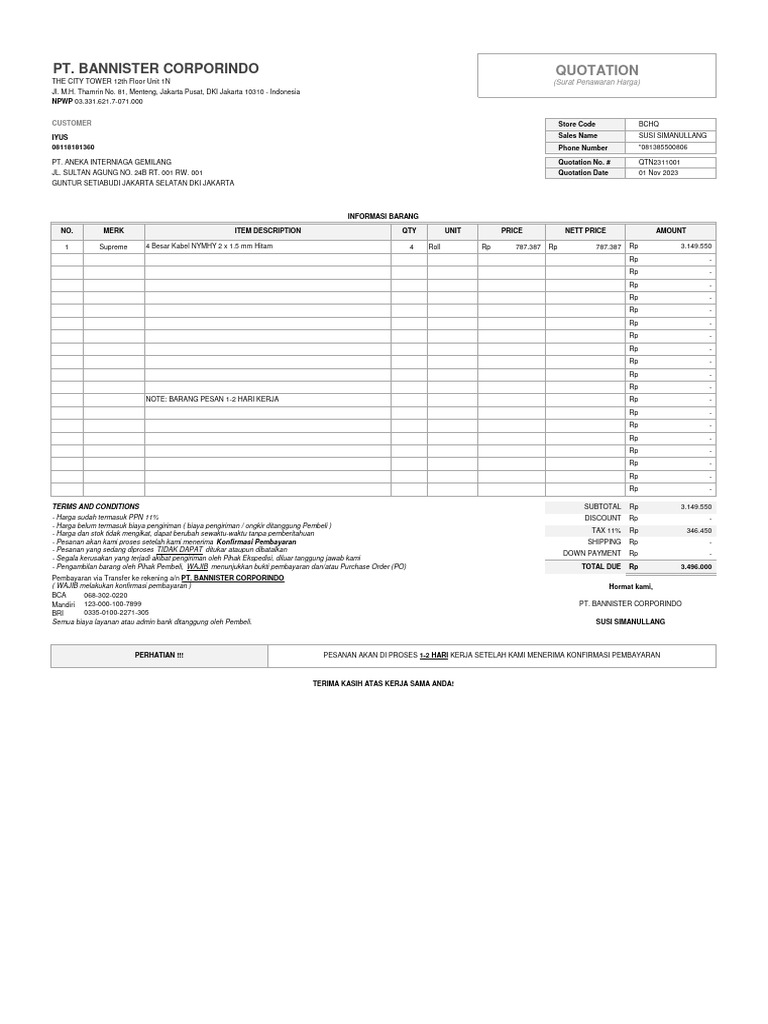PT. ANEKA INTERNIAGA GEMILANG Quotation No. # QTN2311001