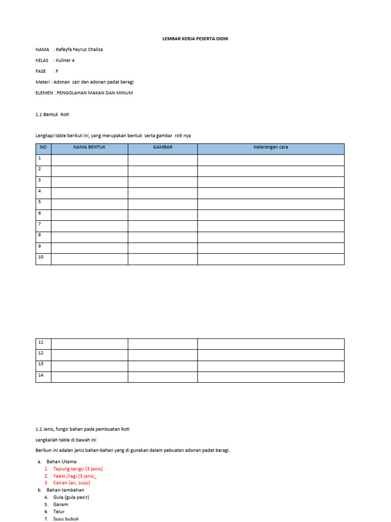 Berikun ini adalan jenis bahan-bahan yang di gunakan dalam pebuatan adonan padat beragi.