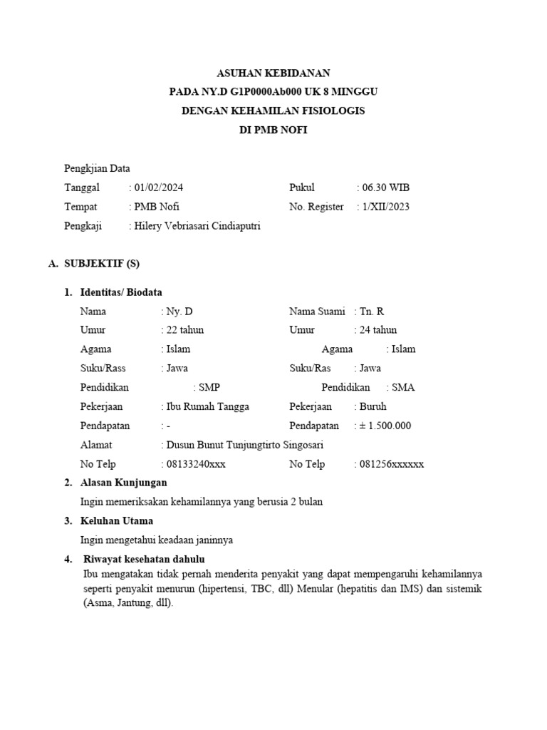 Ny. “D” G1P0000 Ab000 UK 8 minggu dengan kehamilan fisiologi