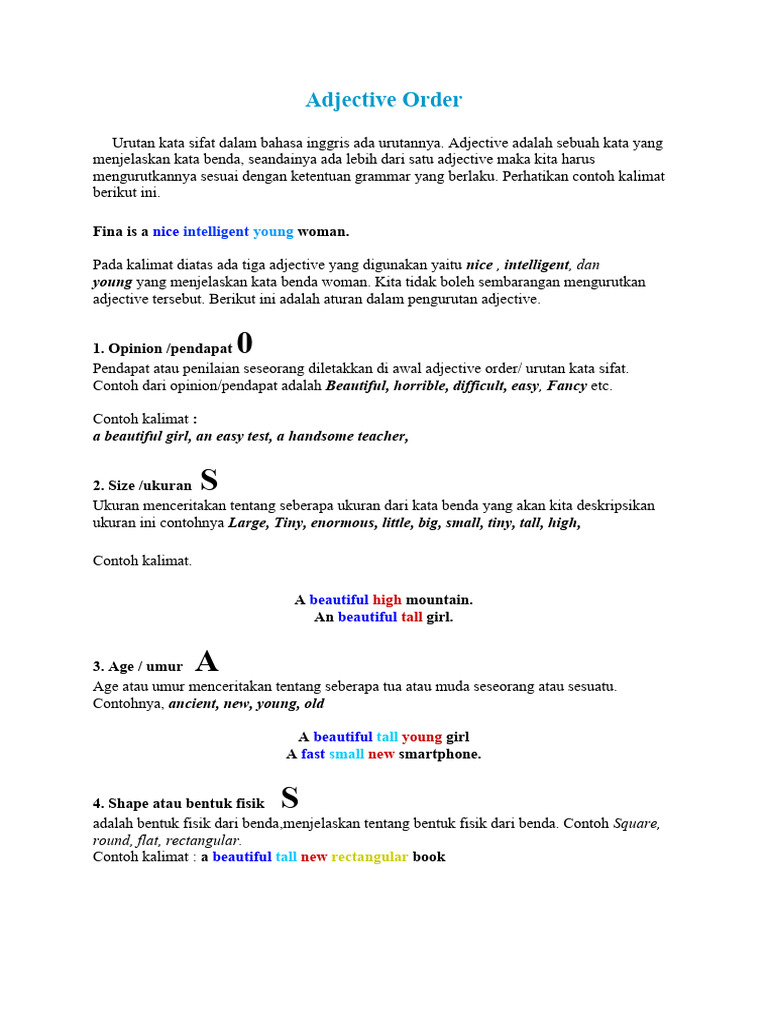adjective tersebut. Berikut ini adalah aturan dalam pengurutan adjective.
