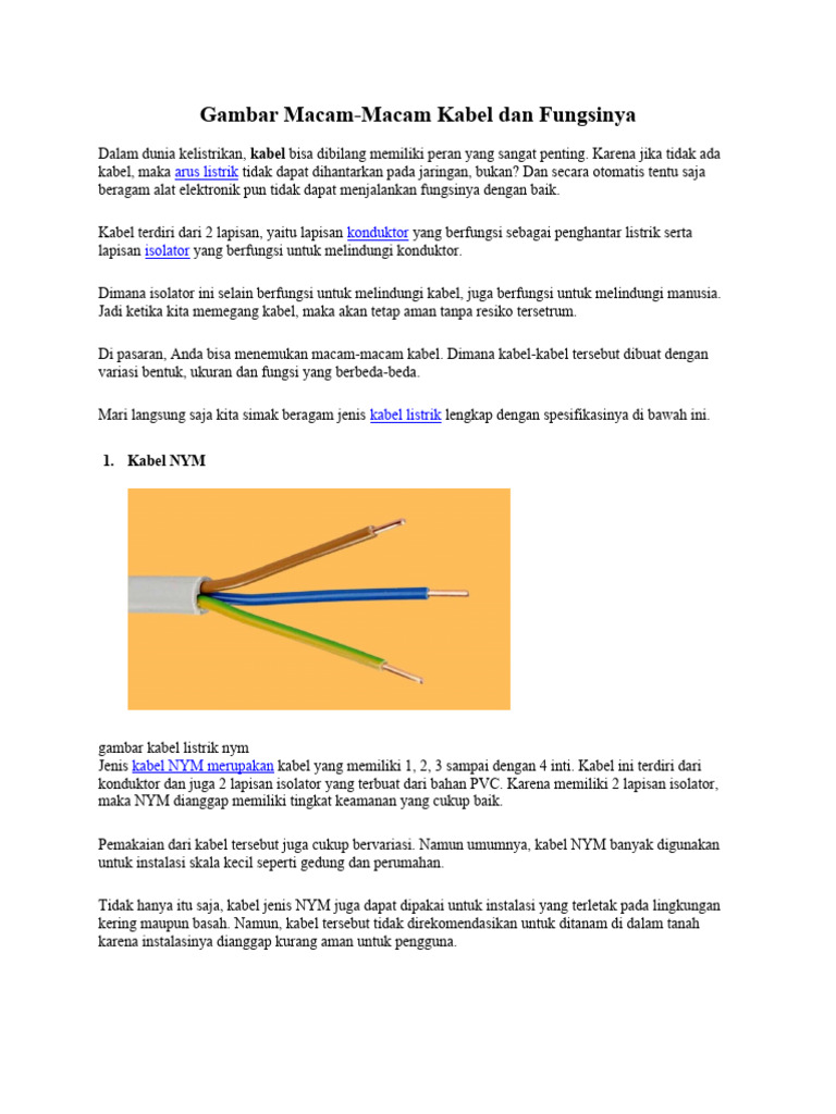 Jenis kabel NYM merupakan kabel yang memiliki 1, 2, 3 sampai dengan 4 inti. Kabel ini terdiri dari