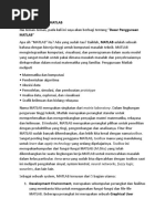 Cara lain pada pengkombinasian dua vector adalah diakukan melalui perkalian elementdemi- element: >> x.*y ans = 4 10 18 Catat periode sebelum perkalian simbol. Sekarang kita dapat mendefinisikan suatu matrix: A = [1 2 3 456 7 8 9]; Catat bahwa matrik tidak diulang kalau kita menggunakan semi colon. Kita sekarang kalikan A dengan transpose dari x: A*x' ans = 14 32 50 Sekarang kita harus mentranspose x untuk memenuhi perkalian suatu matrik dan suatu vector kolom. Matrik-matrik ini dapat juga dikalikan satu sama lain diantara mereka: B = [1 2 3 4 5678 7 6 5 4]; A*B ans = 32 32 32 32 71 74 77 80 110 116 122 128 Sekarang coba anda lakukan penjumlahan antara A dan B: A+B ??? Error using ==> + Matrix dimensions must agree. Baiklah, kita tidak dapat menambah suatu matrik 3 kali 3 dengan matrix 3 kali 4 , dan Matlab akan mendeteksi dimensi yang mismatch dan selanjutnya memeberikan pesan error. Sekarang kita cari cara lain untuk mendefinisikan matrik dan vektor. Sebagai contoh suatu matrik nol dengan dimensi 3 baris dan 6 kolom dapat dinyatakan sebagai: >> zeros(3,6) ans = 0 0 0 0 0 0 0 0 0 0 0 0 0 0 0 0 0 0 tentu saja jika anda tambahkan suatu ";" setelah zeros(3,6), jawabannya tidak akan ditampilkan di layar monitor anda. Angka pertama, 3 menunjukkan jumah baris, sedangkan angka kedua, 6, adalah jumlah