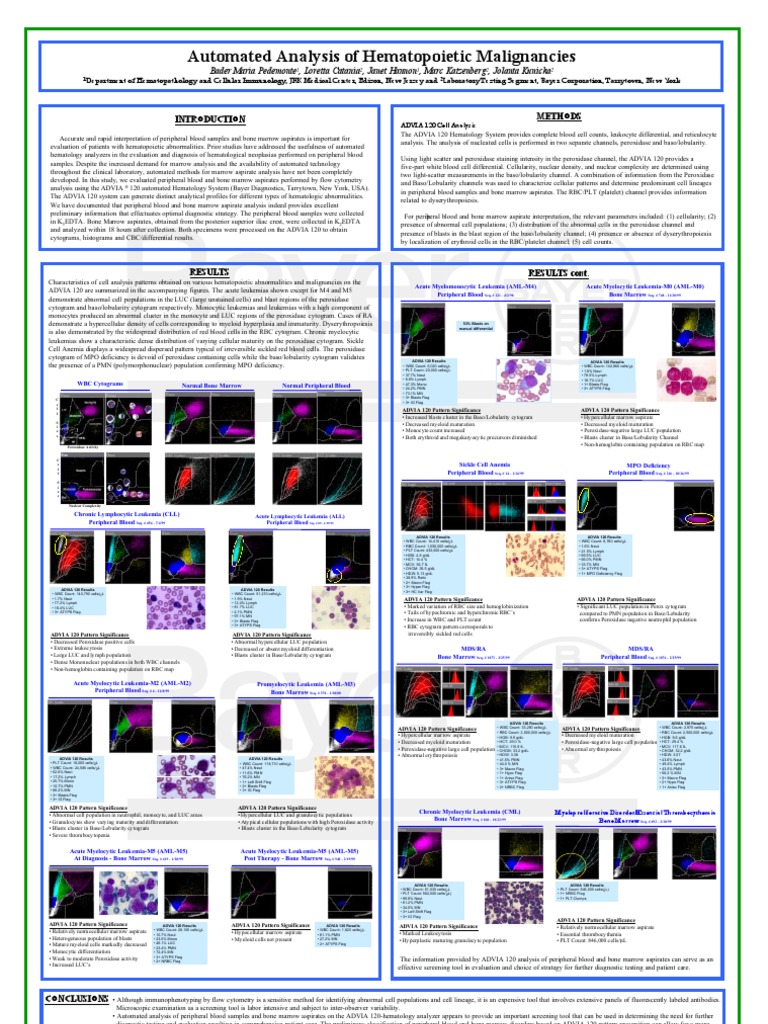 Although immunophenotyping by flow cytometry is a sensitive method for identifying abnormal cell populations and cell lineage, it is an expensive tool that involves extensive panels of fluorescently labeled antibodies. Microscopic examination as a screening tool is labor intensive and subject to inter-observer variability. Automated analysis of peripheral blood samples and bone marrow aspirates on the ADVIA 120-hematology analyzer appears to provide an important screening tool that can be used in determining the need for further diagnostic testing and evaluation resulting in comprehensive patient care. The preliminary classification of peripheral blood and bone marrow disorders based on ADVIA 120 pattern recognition can allow for a more cost-effective selection of monoclonal antibody panels for immunophenotypic studies and thus leads to a more cost effective disease management strategy.
