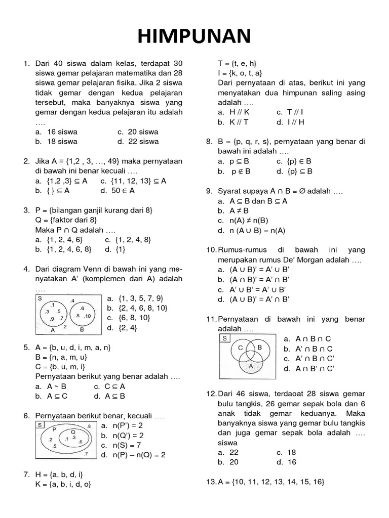 b. A ⊆ C d. A ⊆ B 12. Dari 46 siswa, terdaoat 28 siswa gemar